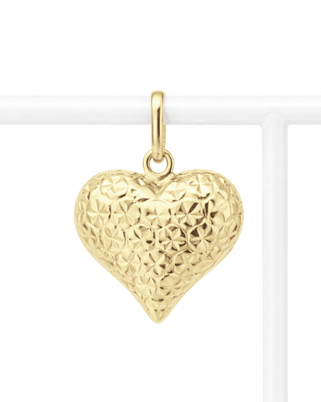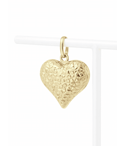 Wyjątkowa zawieszka w kształcie serca wykonana z wysokiej jakości żółtego złota próby 585. Model wyróżnia się bogato zdobioną, diamentowaną powierzchnią, która tworzy efekt subtelnych, geometrycznych rozet rozłożonych na całej powierzchni serca.