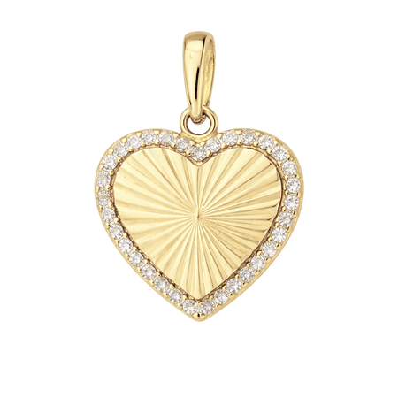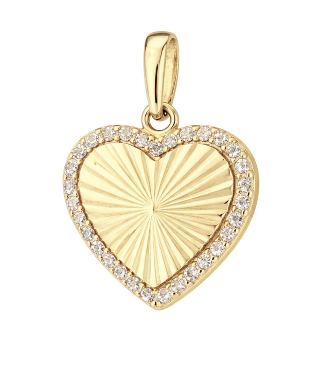 Centralna część serca posiada promienisty, żłobiony wzór rozchodzący się od środka, który efektownie odbija światło i nadaje zawieszce dynamicznego charakteru. Obrzeże zostało ozdobione drobnymi cyrkoniami osadzonymi w precyzyjnej oprawie, tworząc subtelną, połyskującą ramkę podkreślającą kształt serca.