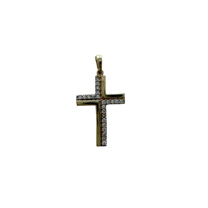 Piękny krzyżyk wykonany ze złota or. 585.. Krzyżyk został wykonany z żółtego złota. Biżuteria wysadzona 23 identycznymi, starannie wyselekcjonowanymi cyrkoniami. Doskonały prezent na I Komunię, Chrzest, Bierzmowanie, Ślub.