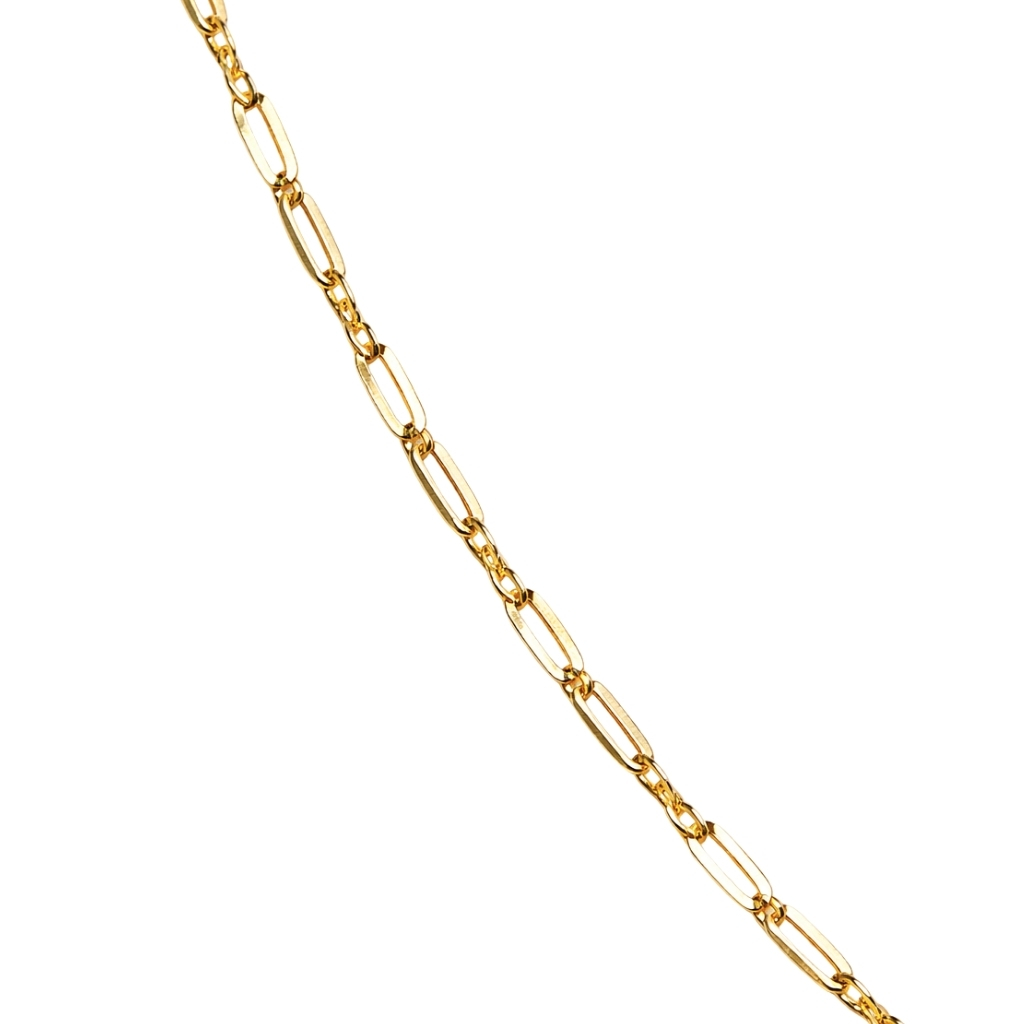Łańcuszek został wykonany z żółtego złota próby 585 (14K). Jego delikatna forma oparta na wydłużonych, regularnych ogniwach nadaje biżuterii subtelnego i eleganckiego charakteru.