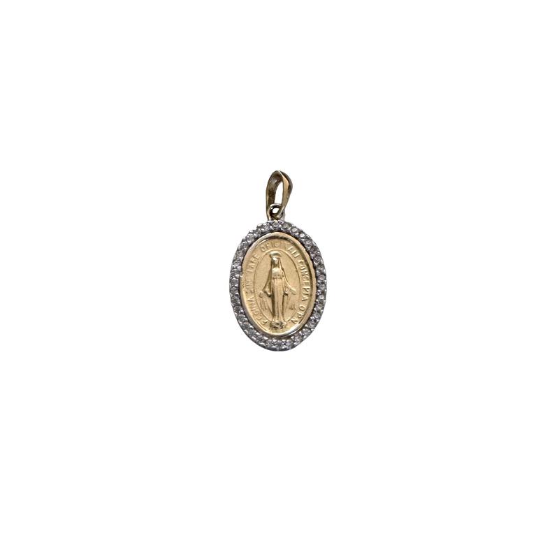 Piękny, subtelny medalik z wizerunkiem Matki Boskiej  wykonany ze złota pr.585. Medalik jest otoczony idealnie wyselekcjonowanymi cyrkoniami. Nosi się go jako symbol wiary, nadziei i opieki Matki Boskiej. Rewers melika to znak litery M w otoczeniu 12 gwiazd.