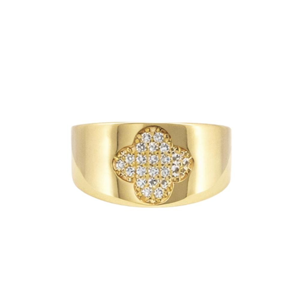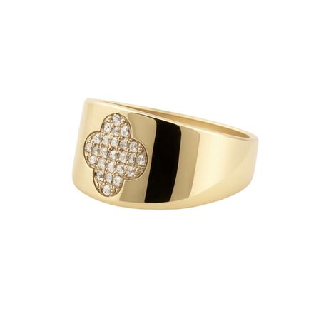 Pierścionek został wykonany z żółtego złota próby 585 (14K). Szeroka, gładka forma nadaje całości eleganckiego charakteru. Centralnym elementem jest dekoracyjne zdobienie w kształcie czterolistnej koniczyny, wysadzane drobnymi cyrkoniami.