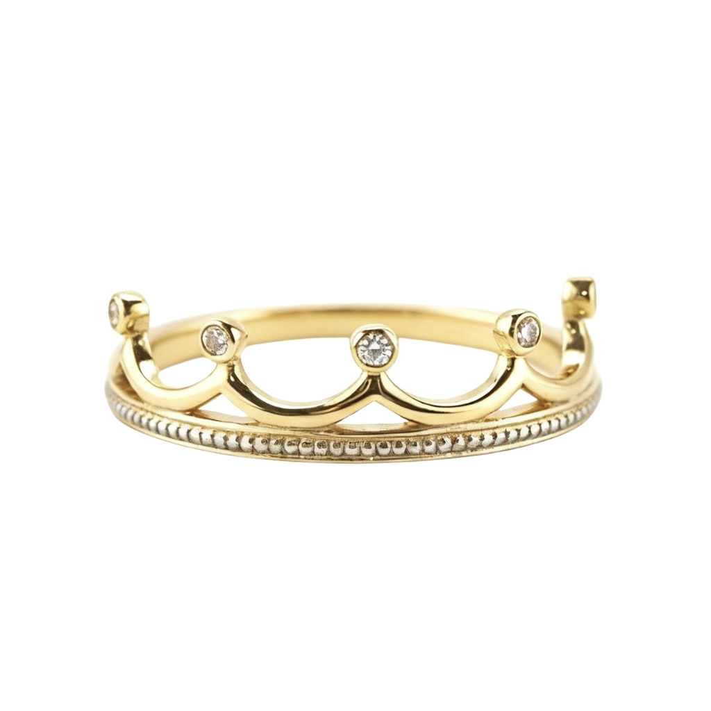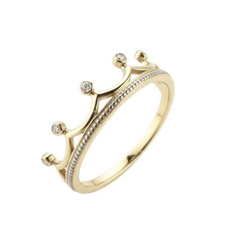 Pierścionek został wykonany z wysokiej jakości żółtego i białego złota próby 585 (14K). Jego oryginalna forma inspirowana jest motywem korony, co nadaje mu elegancji i niepowtarzalnego stylu. Subtelnie osadzone cyrkonie pięknie odbijają światło, dodając całości blasku i lekkości.