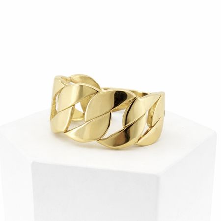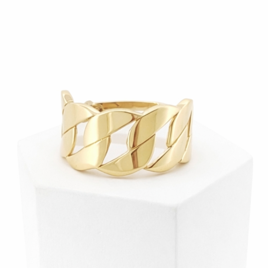 Pierścionek został wykonany z żółtego złota próby 585 (14K). Jego wyrazista forma inspirowana splotem łańcuchowym nadaje całości nowoczesnego charakteru.