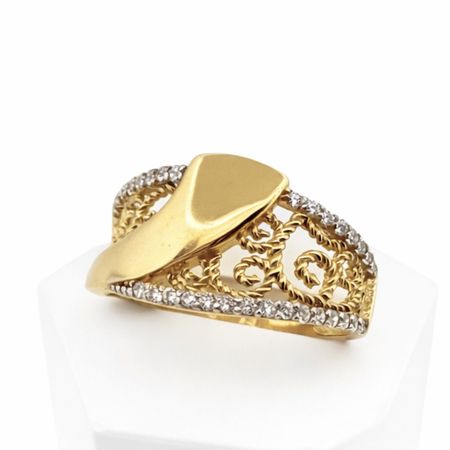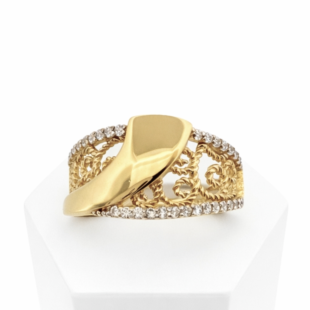 Pierścionek został wykonany z żółtego złota próby 585 (14K). Wyjątkowa, ażurowa konstrukcja nadaje mu lekkości i dekoracyjnego charakteru, tworząc efektowną kompozycję inspirowaną ornamentalnymi wzorami.