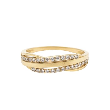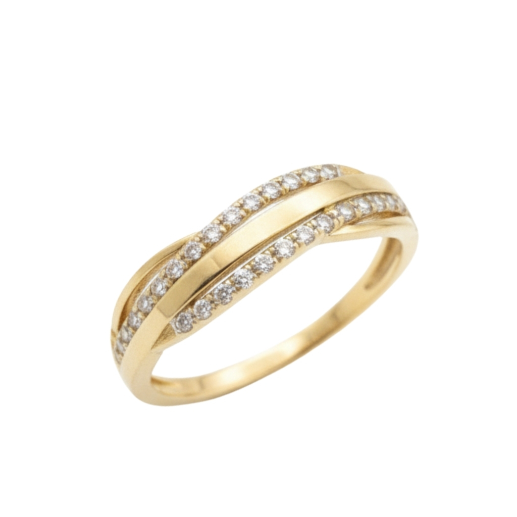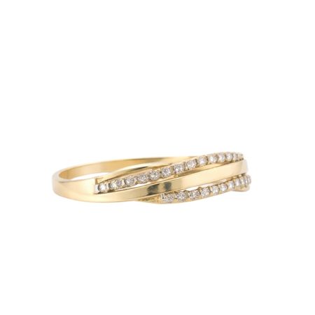 Pierścionek został wykonany z wysokiej jakości żółtego złota próby 585 (14K). Nowoczesna, przeplatająca się forma została ozdobiona subtelnie osadzonymi cyrkoniami, które pięknie odbijają światło i nadają całości wyjątkowego blasku.