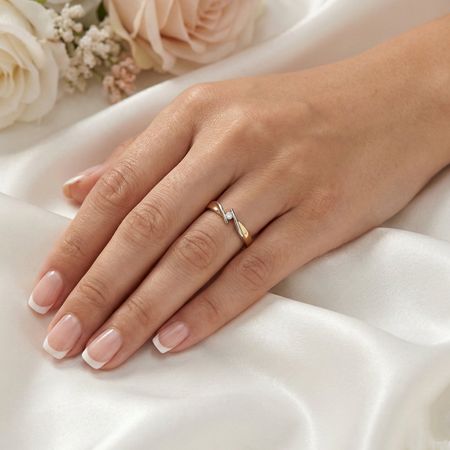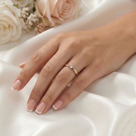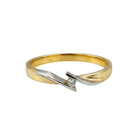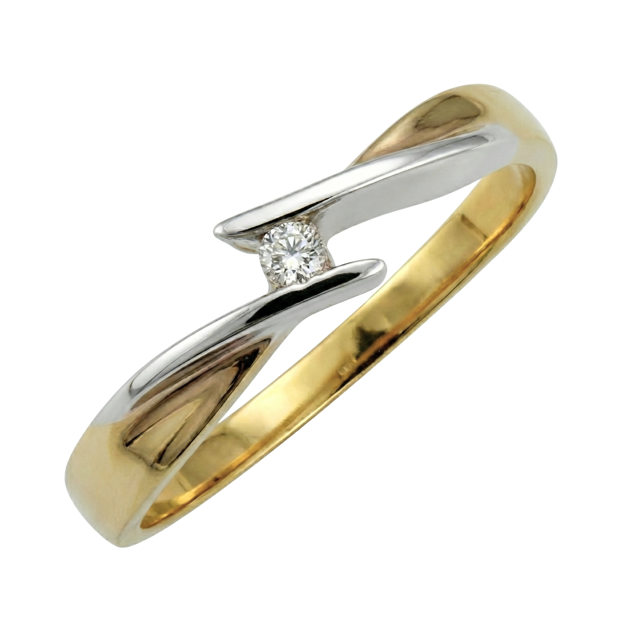 Złoty pierścionek z brylantem został wykonany z połączenia najwyższej jakości żółtego i białego złota próby 585 (14K) oraz brylantu SI/H o masie 0,03 ct. Pierścionek charakteryzuje się smukłą i delikatną formą o nowoczesnym charakterze. Centralny element tworzą dwie proste o zróżnicowanym wykończeniu kolorystycznym z subtelnym brylantem, osadzonym w gładkiej, niskiej oprawie, harmonijnie wpisanej w linię pierścionka - zapewniając spójny i estetyczny wygląd. Całość prezentuje się minimalistycznie, tworząc przy tym szykowny efekt.