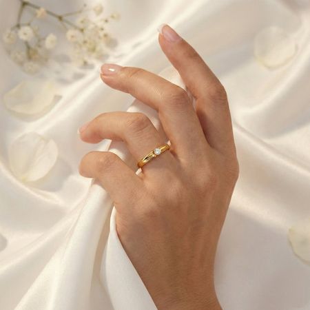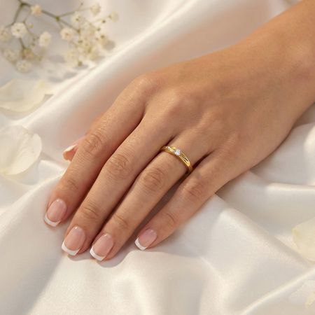 Złoty pierścionek z brylantem został wykonany z najwyższej jakości żółtego złota próby 585 (14K) oraz brylantu o masie 0,04 ct. Pierścionek ma lekką, harmonijną formę z delikatnie wyprofilowaną obrączką. Brylant został osadzony w subtelnym zagłębieniu, sprawiając wrażenie miękko „wtopionego” w linię pierścionka. Całość prezentuje się minimalistycznie, tworząc przy tym szykowny efekt.