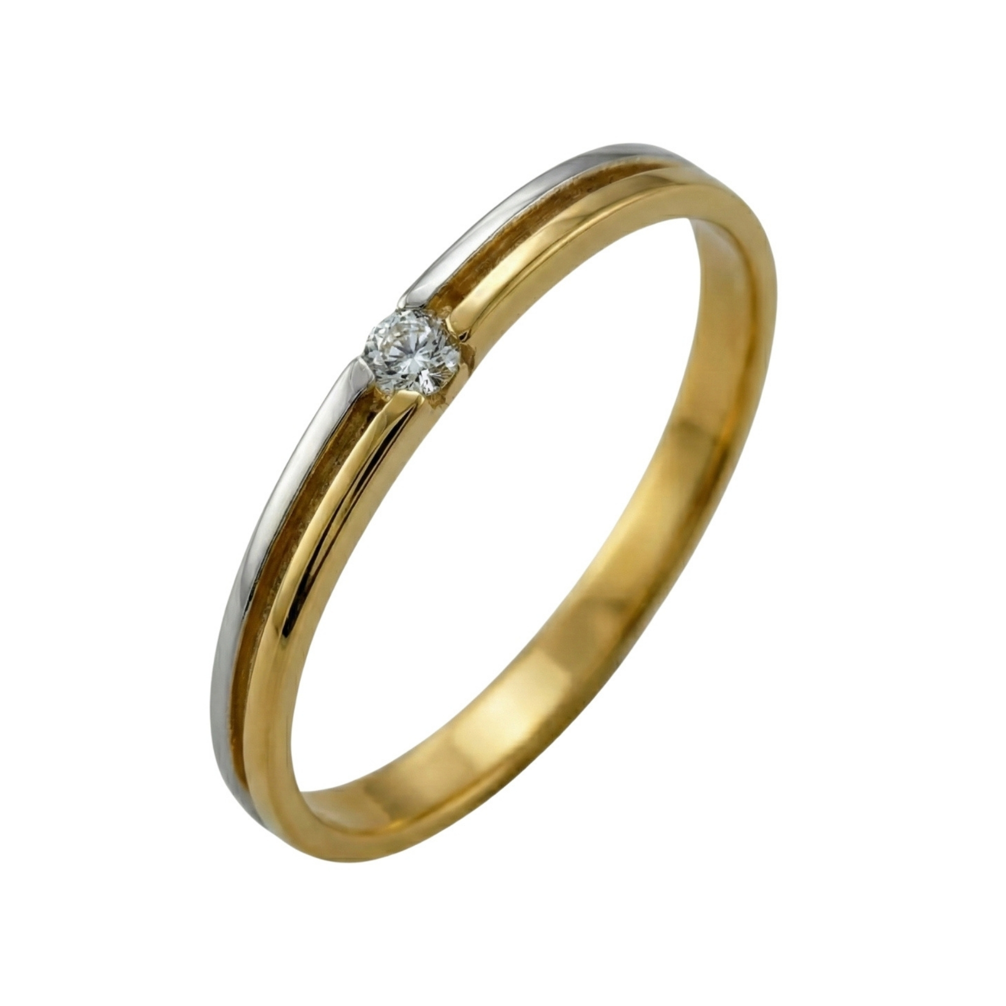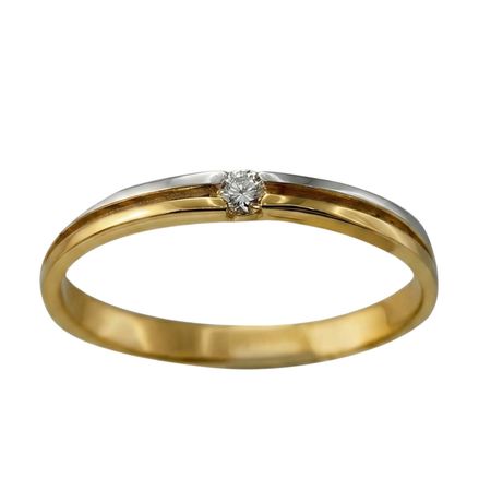 Złoty pierścionek z brylantem został wykonany z połączenia najwyższej jakości żółtego i białego złota próby 585 (14K) oraz brylantu o masie 0,04 ct. Pierścionek charakteryzuje się klasyczną obrączką oraz smukłą i delikatną formą o nowoczesnym charakterze. Centralnym punktem jest brylant osadzony w prostej, niskiej oprawie, subtelnie wkomponowanej w linię dwukolorowej obrączki. Całość prezentuje się minimalistycznie, tworząc przy tym szykowny efekt.