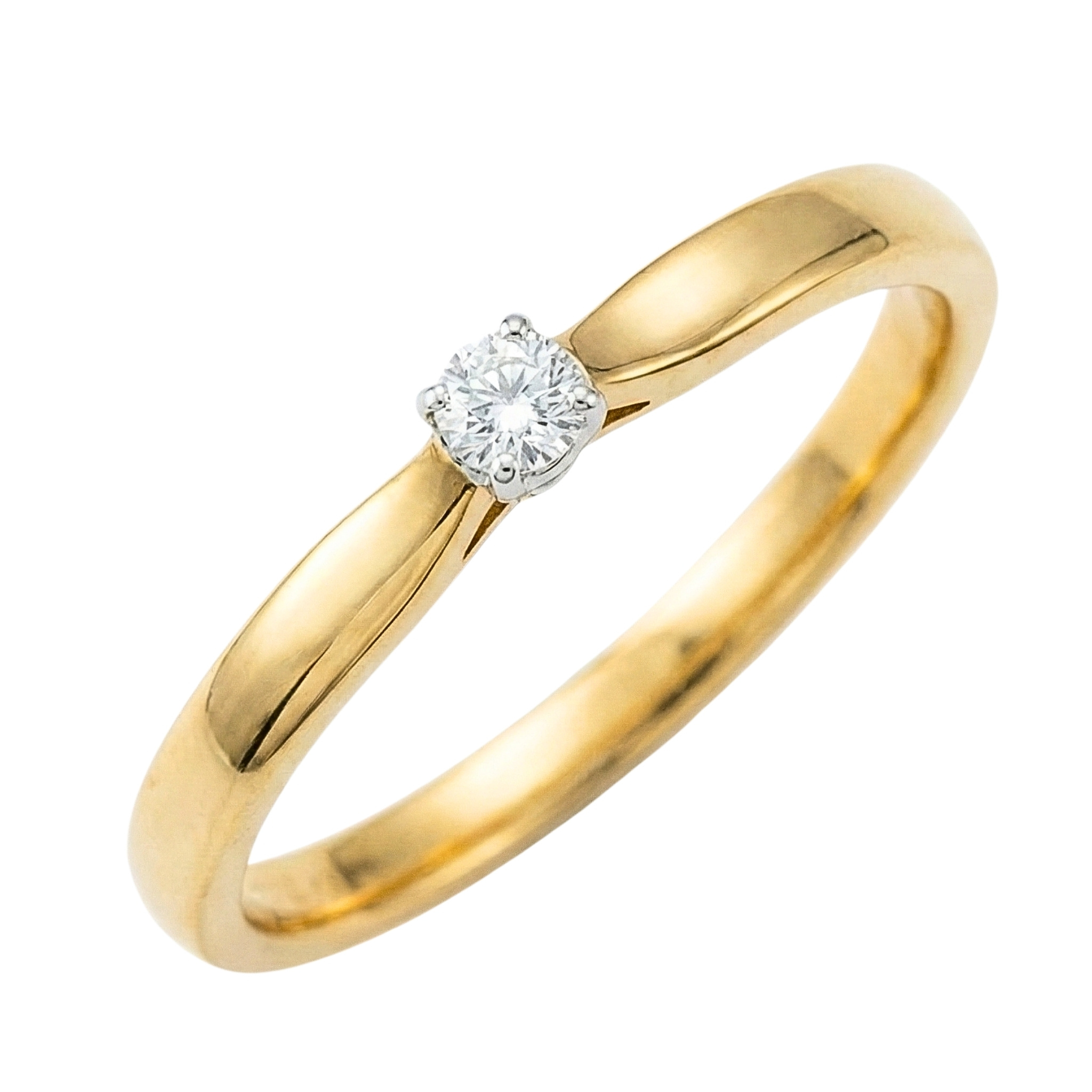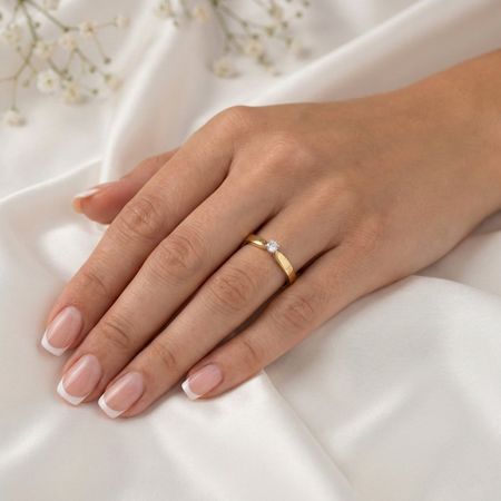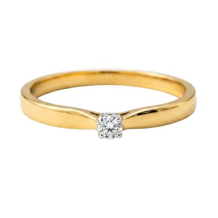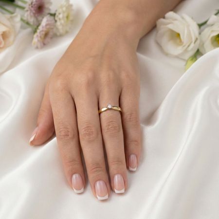 Złoty pierścionek z brylantem został wykonany z najwyższej jakości żółtego złota próby 585 (14K) oraz brylantu SI/H o masie 0,05 ct. Pierścionek charakteryzuje się prostą, precyzyjnie wyprofilowaną formą o gładkiej, symetrycznej obrączce. Brylant osadzony jest centralnie w niskiej, zintegrowanej oprawie, która zachowuje spójność linii pierścionka. Całość tworzy elegancką, technicznie czystą i ponadczasową kompozycję. Całość prezentuje się minimalistycznie, tworząc przy tym szykowny efekt.