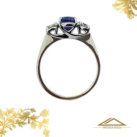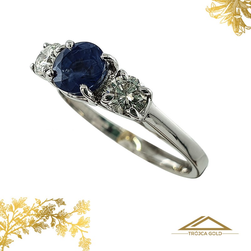 Pierścionek z dwoma brylantami oraz naturalnym szafirem, oprawiony w białe złoto próby 585.