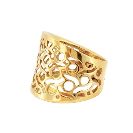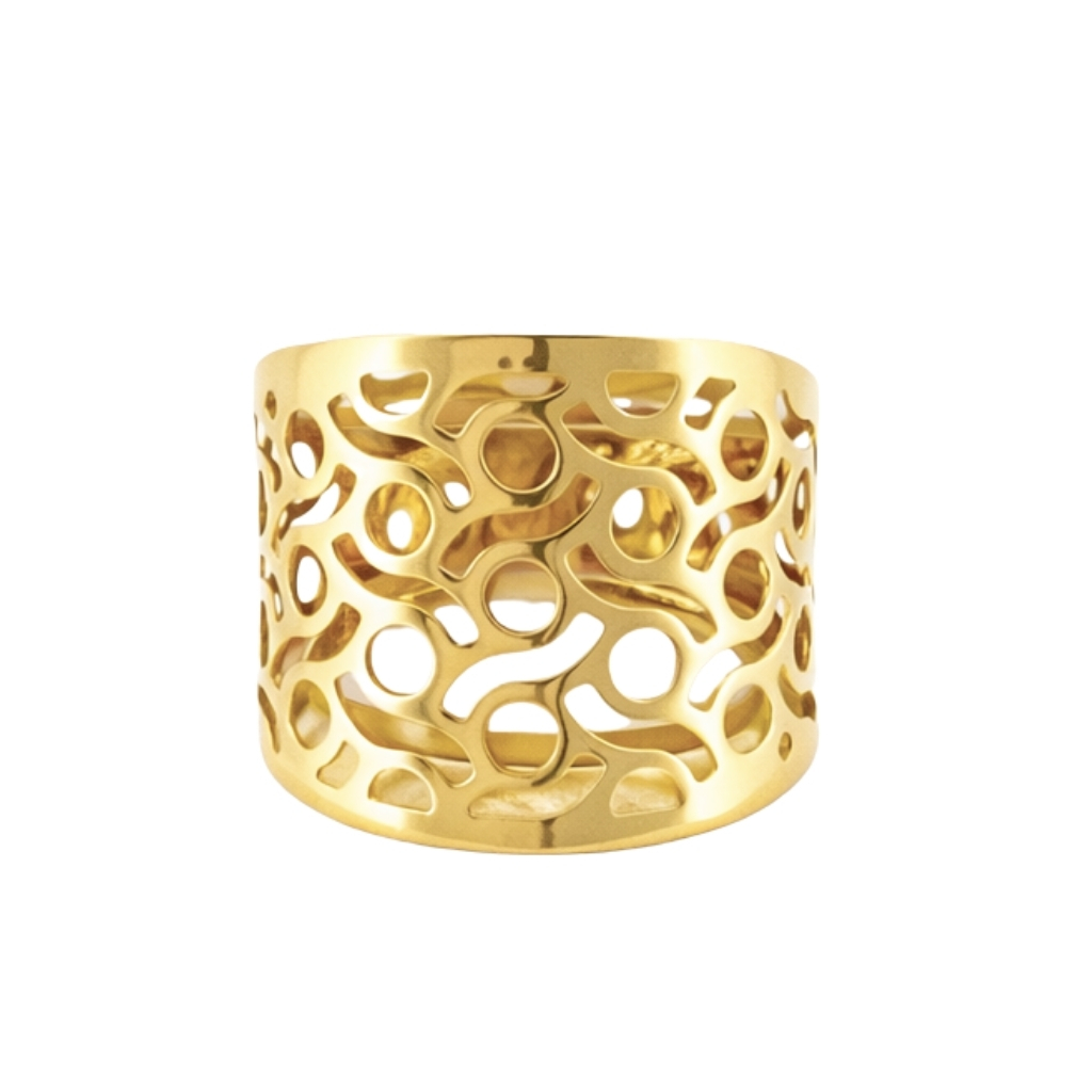 Pierścionek został wykonany z żółtego złota próby 585 (14K). Szeroka, efektowna forma oraz ażurowy wzór nadają mu wyrazisty i nowoczesny charakter. Nieregularne wycięcia tworzą ciekawą kompozycję, która przyciąga uwagę i podkreśla unikalny styl biżuterii.