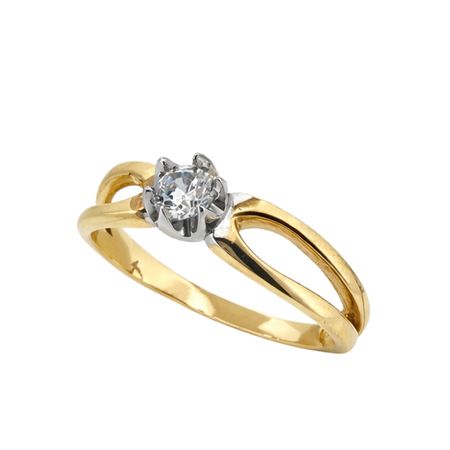 Pierścionek został wykonany z żółtego i białego złota próby 585 (14K). Połączenie dwóch kolorów kruszcu nadaje biżuterii eleganckiego i ponadczasowego charakteru.