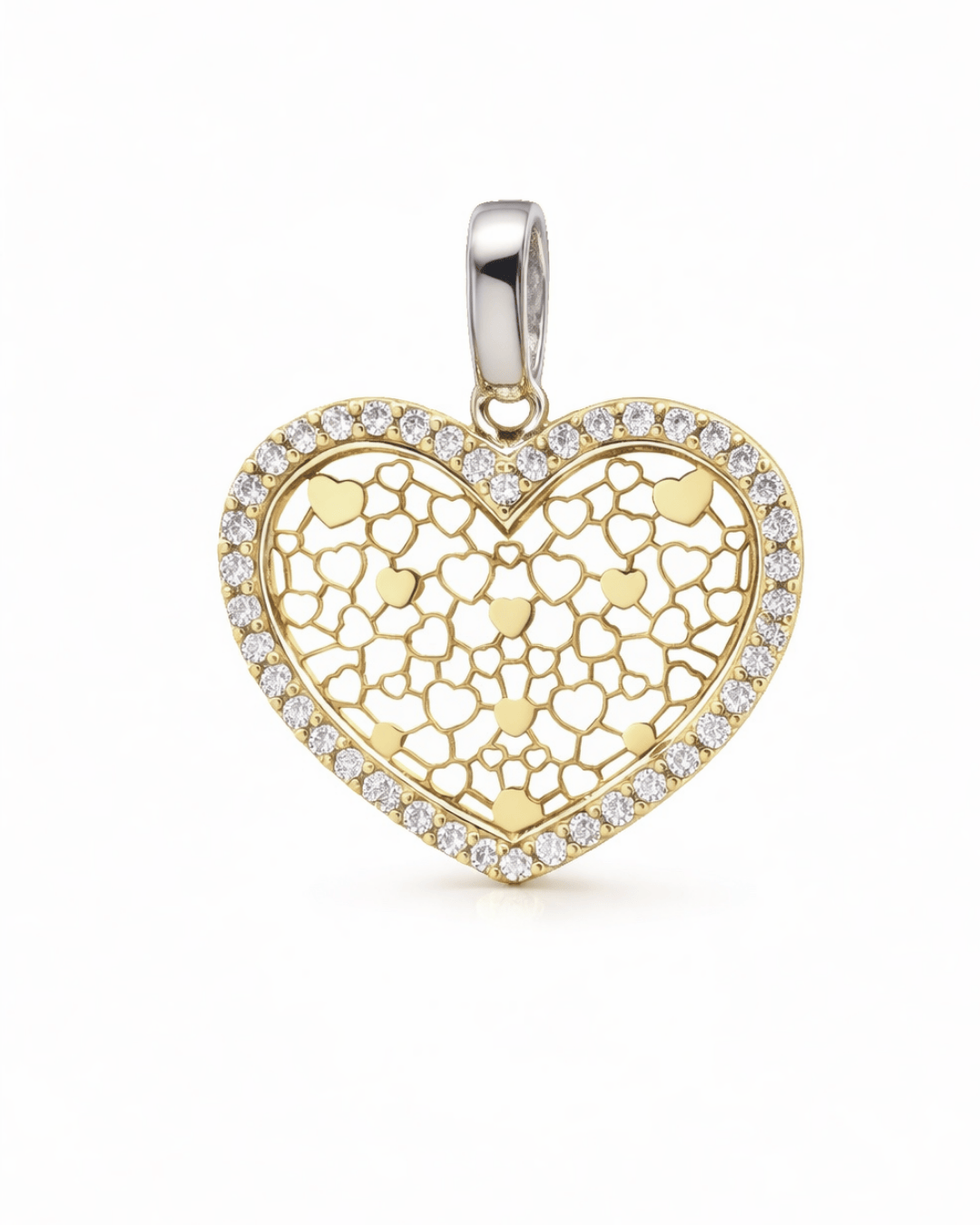 Wisiorek w kształcie serca został wykonany z wysokiej jakości żółtego złota próby 585. Model wyróżnia się efektowną, ażurową kompozycją wnętrza, utworzoną z licznych drobnych serduszek połączonych w dekoracyjną strukturę.